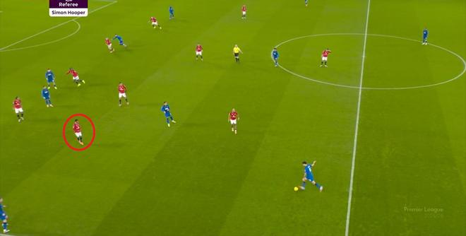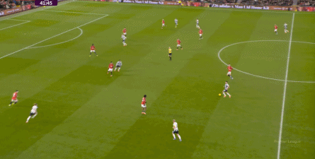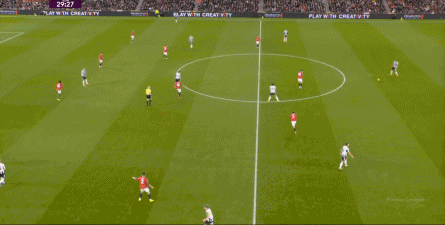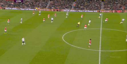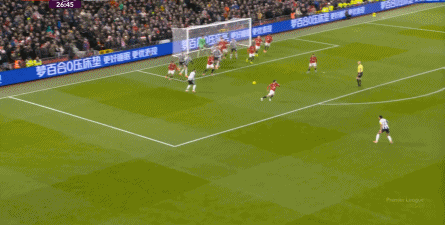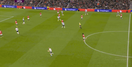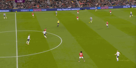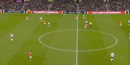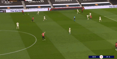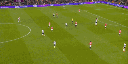 这个位置,其实指的就是阿玛德目前的队内位置,三后卫体系当中的右翼卫,但在实际上,阿玛德的无球位置也并不像翼卫,他经常因为压迫和进攻职责出现在左中卫身前,只是需要跟人和防守的时候才会回到禁区内和边线处: