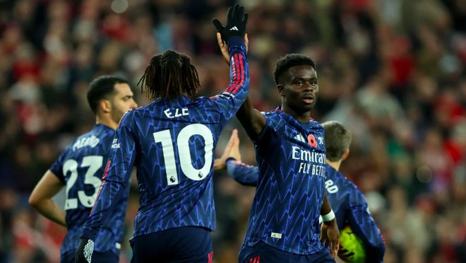 阿森纳首发:1-拉亚、2-萨利巴、6-加布里埃尔、12-廷伯、33-卡拉菲奥里、10-埃泽、23-梅里诺、36-苏维门迪、41-赖斯、7-萨卡、19-特罗萨德。