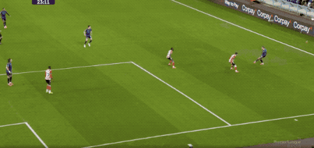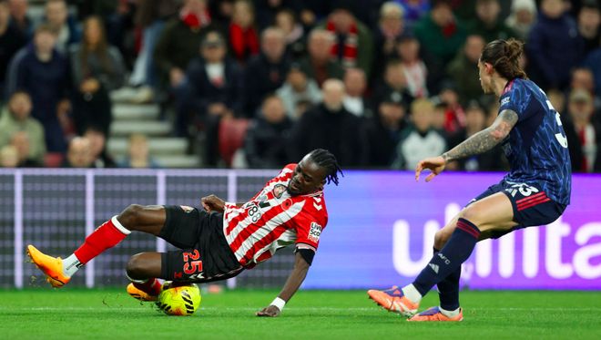 上半场补时阶段,卡拉菲奥里45度传中,萨卡头球摆渡,萨利巴一脚劲射,放了高射炮。