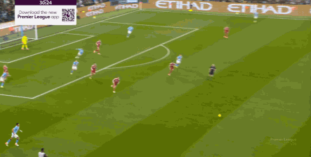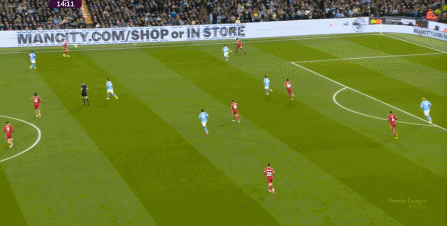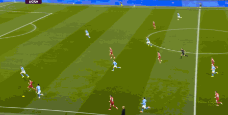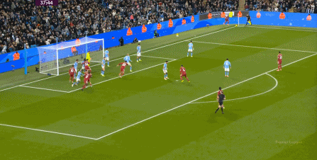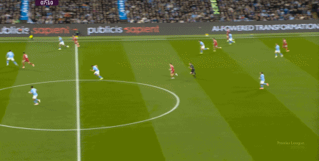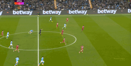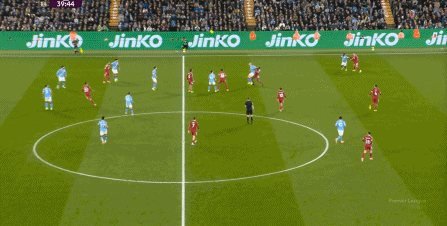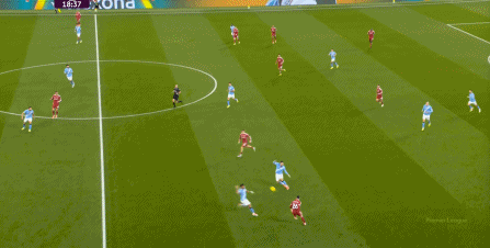 就像第17分钟这次一样,利物浦看似抓住了哈兰德停球过大的问题,但曼城立刻通过小个子球员完成反抢,再一次通过左路的进攻形成了门前的机会: