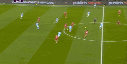 一个非常简单的反制思路,就是在中场区域进行绞杀战术,通过单点上的力量和对抗能力来打出曼城在中场区域的局限,而利物浦其实在上半场末段,就这样得到了最好的一次转化进攻的机会: