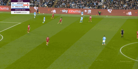 方向上其实还是萨拉赫VS奥赖利这一侧,但是在索博斯洛伊的帮助下顺利打出的,只不过维尔茨的转身射门被曼城轻易堵住。