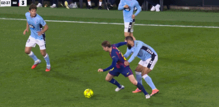第11分钟,迅速扳平!卡雷拉快速突破推射破门,塞尔塔1-1巴萨